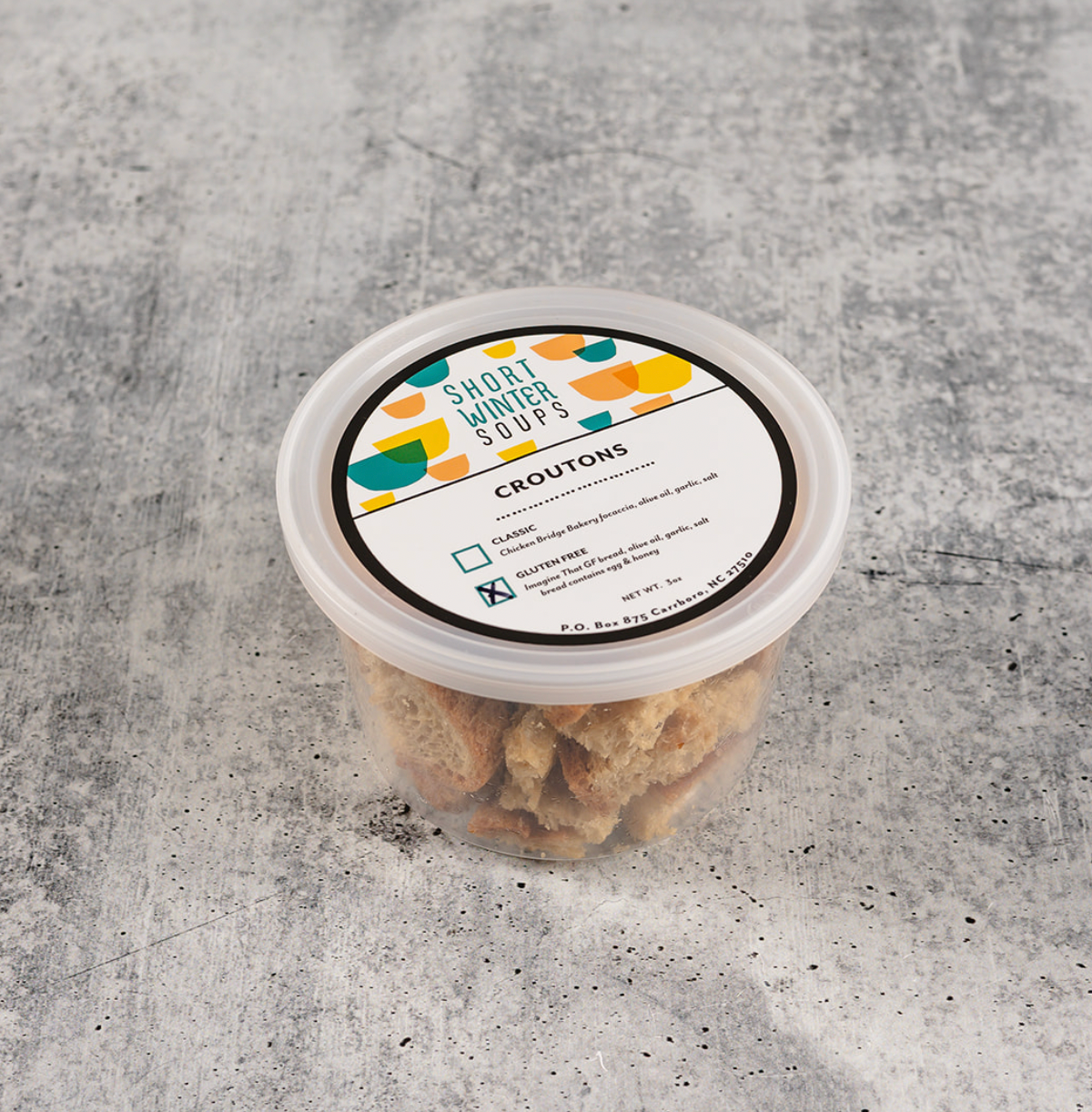 Imagine That GF's country white loaf is cubed and tossed with our house made roasted garlic oil, then slow baked for two hours to produce a crunchy and flavorful crouton great on soups, salads and by the handful.