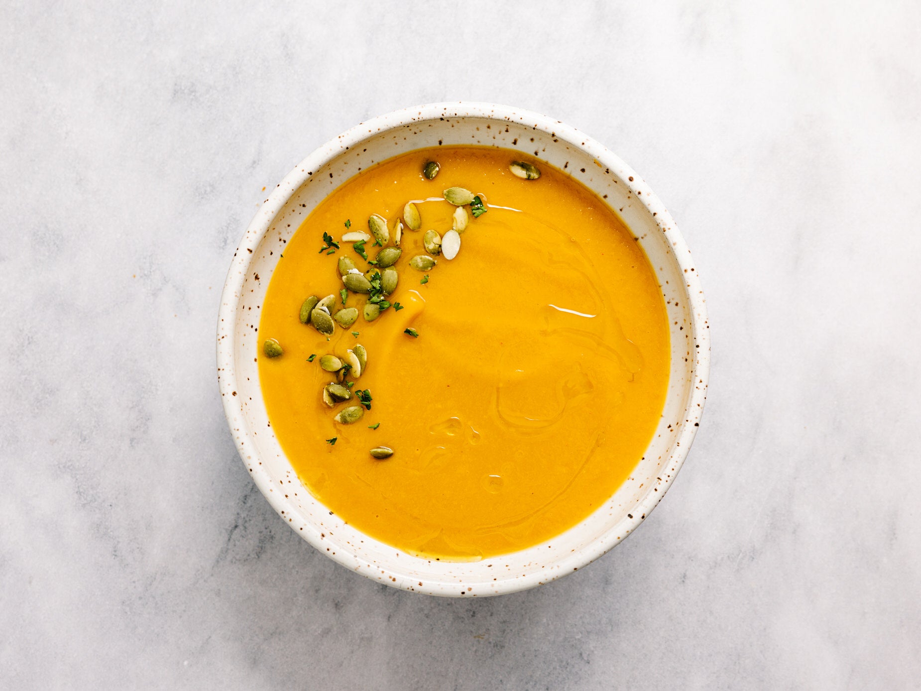 Roasted pumpkin and apples are blended with caramelized onions, roasted garlic, rosemary, lavender and white pepper.
